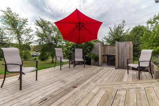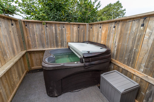 private hot tub overlooking a near 1 acre lot full of fruit trees and a nicely landscaped terrace.